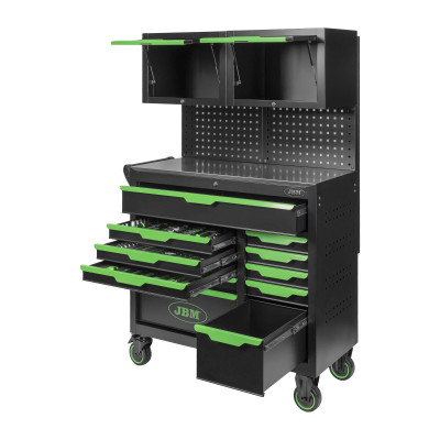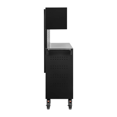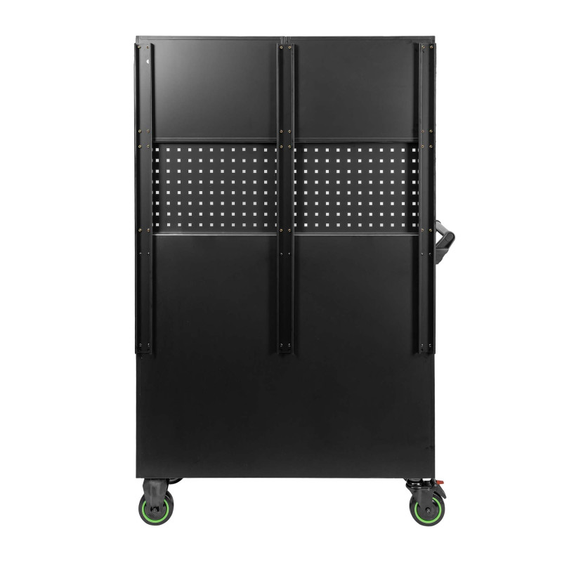 Conjunto de carrinho com painéis perfurados e armários de parede para oferecer um extra de armazenamento e versatilidade. Combina o grande espaço de armazenamento adicional com a mobilidade e polivalência do carrinho para dar resposta a qualquer situação de trabalho.