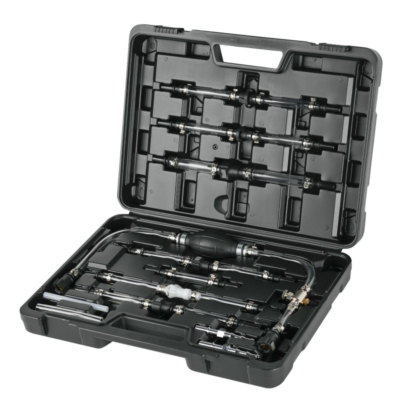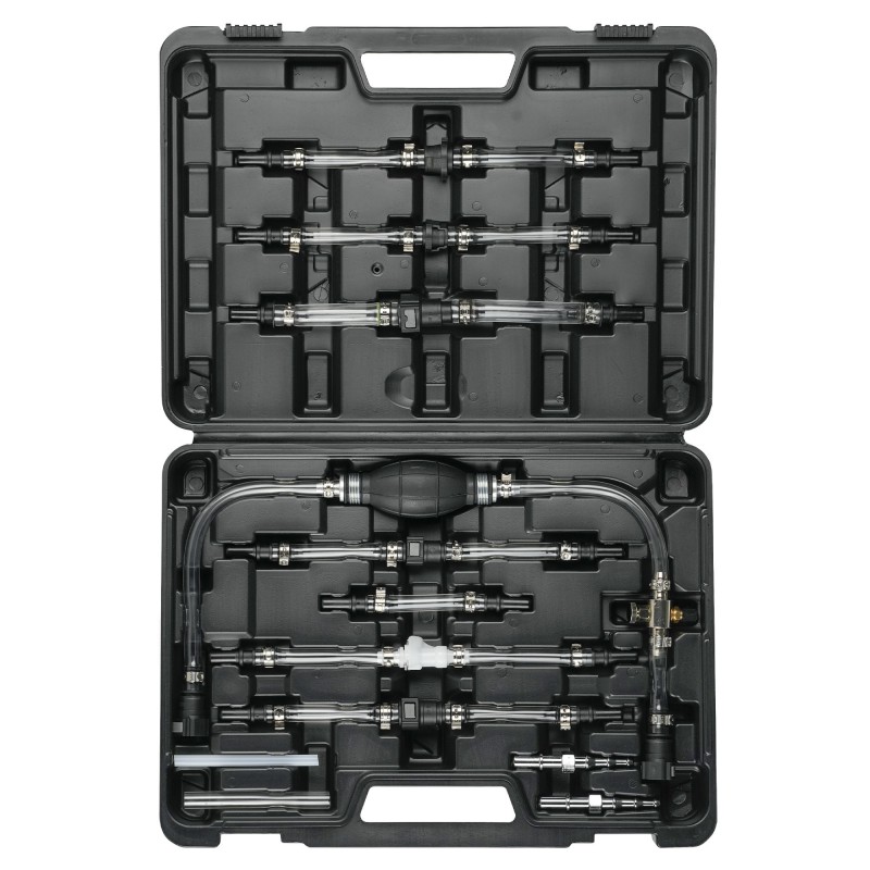 Este kit completo de purga de combustível foi concebido para funcionar com o circuito de combustível de baixa pressão, reintroduzindo o combustível na linha após a manutenção. Os tubos transparentes permitem a deteção visual de ar no sistema de combustível ou na linha de aspiração acidental. Equipado com os mais recentes conectores rápidos macho e fêmea encontrados em veículos Fiat, Ford, Land Rover, Mercedes-Benz, PSA, Renault, Rover e Vauxhall/Opel.